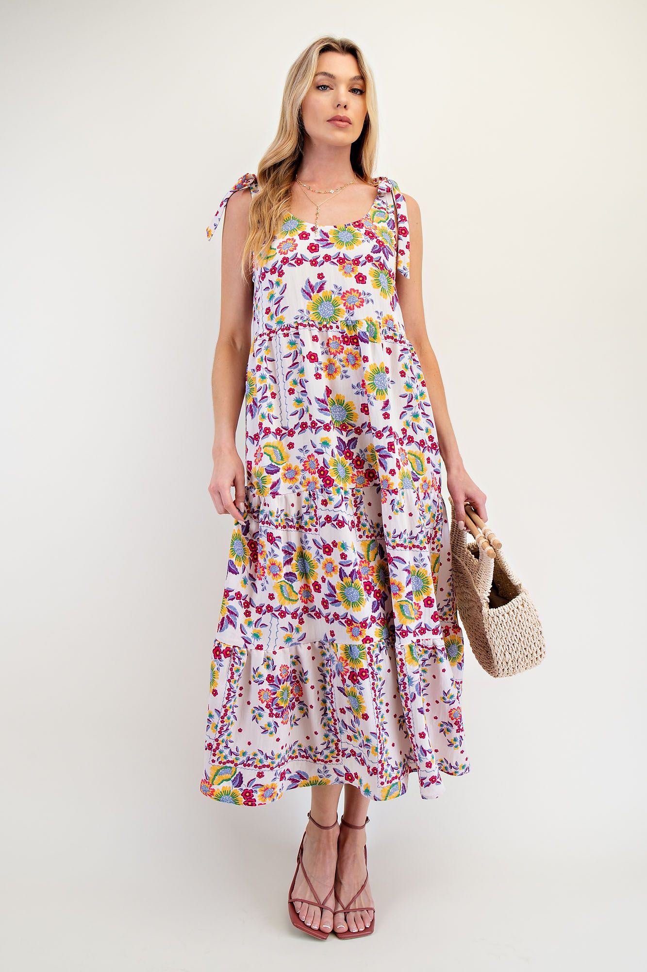 Designed in a lightweight rayon-nylon fabric, this dress features a vibrant floral print that brings a soft, joyful feel to your look. The tiered silhouette creates beautiful movement, while the relaxed fit keeps it comfortable and flattering.