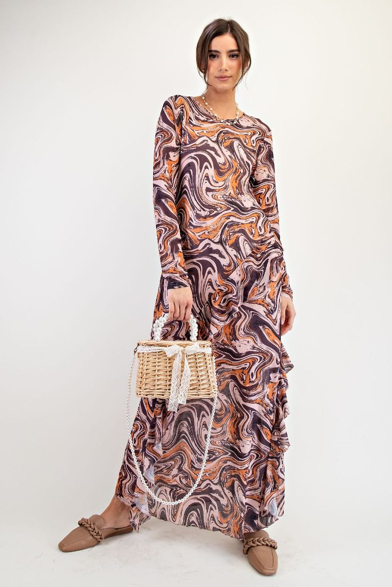 The Sienna Dress is soft, fluid, and full of movement. Crafted in a lightweight mesh with an artful geo print, this maxi features long fitted sleeves, a rounded neckline, and a subtle ruffle hem that adds graceful flow with every step. Designed for effortless wear with a relaxed, easy fit.