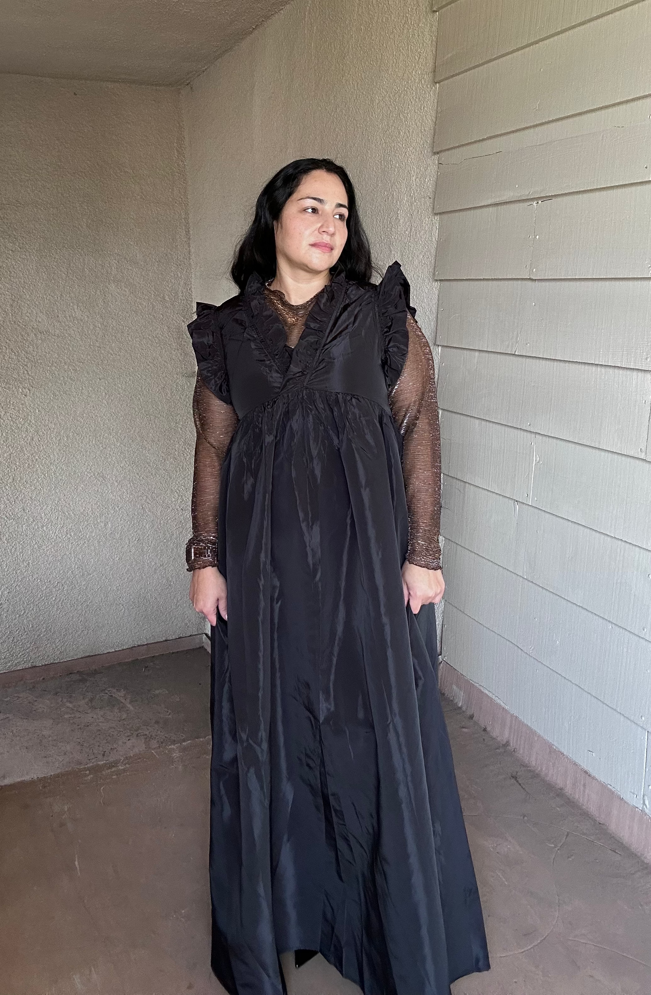 Ruffled shoulders and a sweeping full skirt create a silhouette that’s bold yet elegant — and the forgiving fit makes it effortless for every body type to wear.